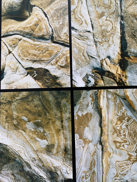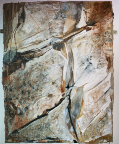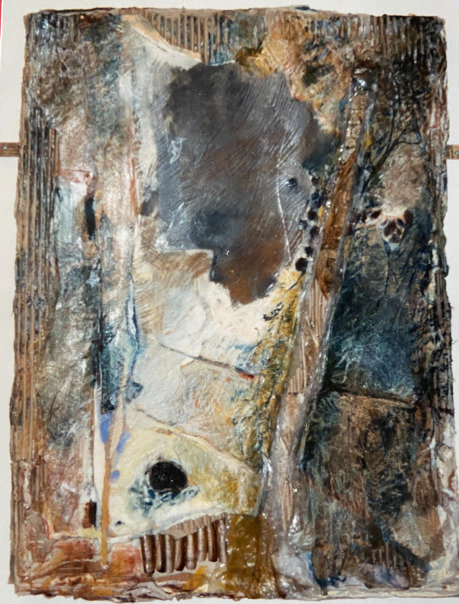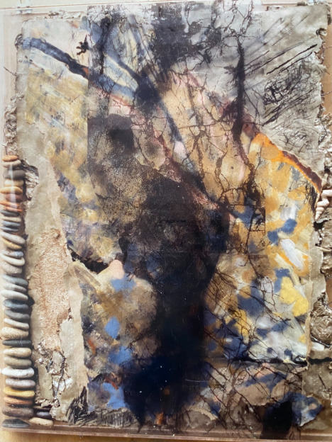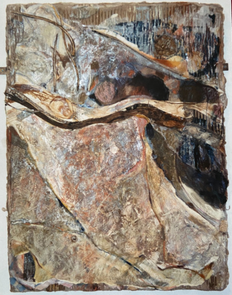 The first art I made in my new beginning was incoherent. I was unsure how to continue. The work I had made before seemed pointless in the face of death. I discovered a series of striated rocks and pools near Scarborough Spa. They were exciting like maps to an unknown country. I became interested in geology and the way rock and sand are formed. The constant recycling and transformation. The fragility of rockpool life exposed to sea and weather. It resonated with my loss. I made drawings using sticks and ink and graphite. These developed into the Song Line Series, using layered corrugated card. This allowed me to embed objects like fossils in rock and opened meanings into symbolism.