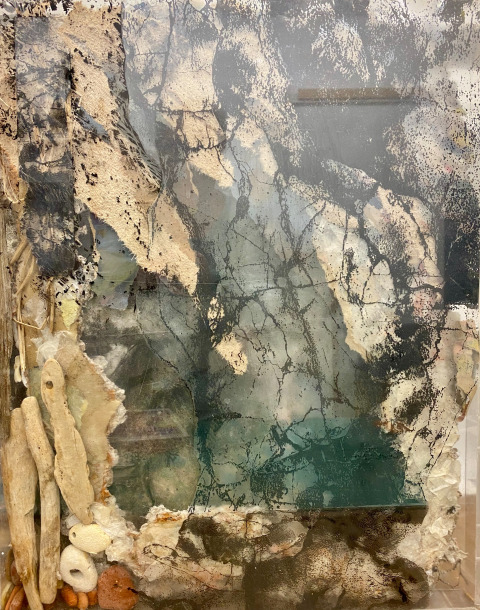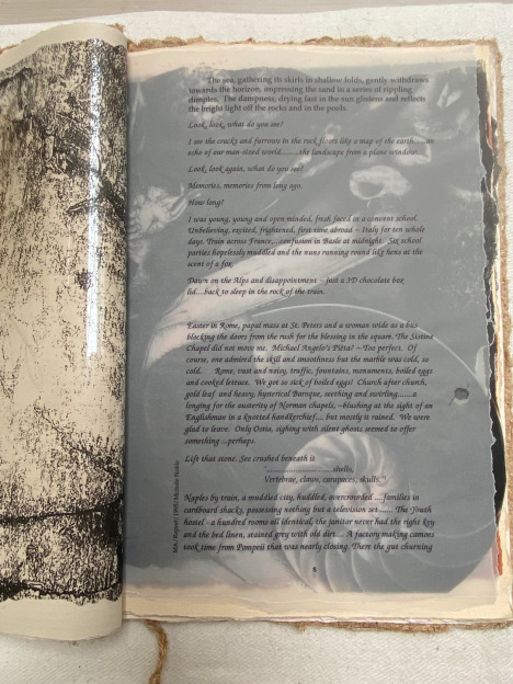 I used papier mâché from all the paper that came into the house over a couple of months, like envelopes, wrapping paper etc, the ephemera of daily life. The shredding required to make paper pulp, satisfied a need to ritualise and the raw material incorporated both past and present, also an acknowledgement of the millions of dead sea creatures that had formed the sand and rock in the first place. It seemed a satisfactory metaphorical solution, it was light and could be made rocklike. Scraps of glossy magazines in the mix, left traces of colour like fragments of shells, wisps of memory. I built cairns for the dead from towers of pebbles and the dried seaweed became twisted into beautiful shapes echoing bone. I photocopied actual shells, crabs, sea urchins on film, to resemble water. Finally, I displayed these objects within plastic boxes so everything was visible. These were suspended by rope and fishhooks space so both sides could be seen but only one side at once – high and low tide.