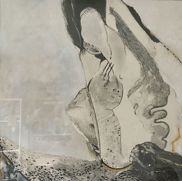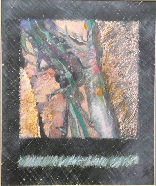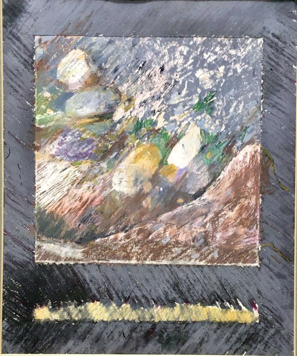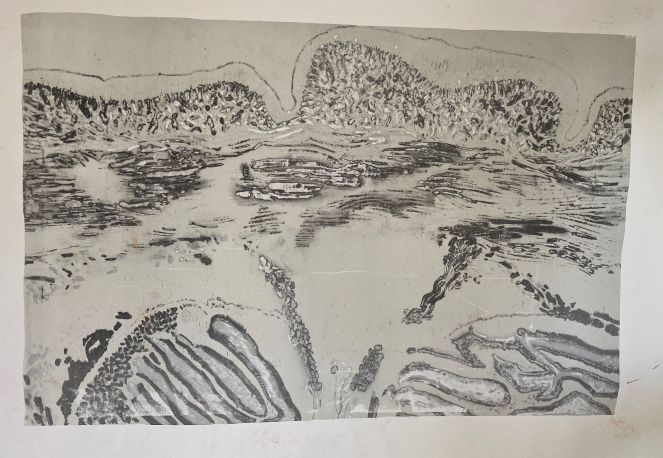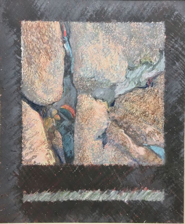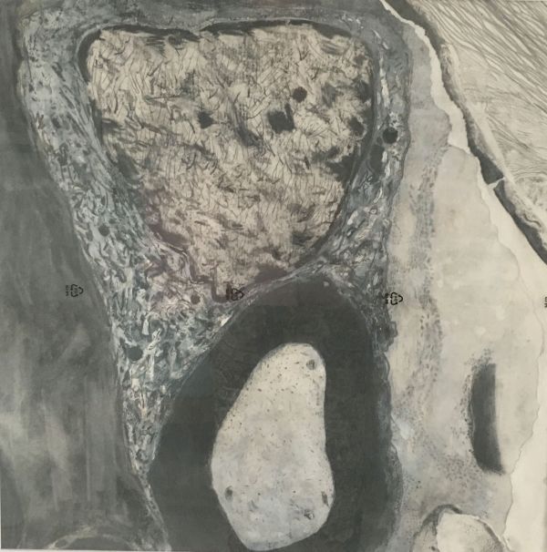 I applied to study the MA in Art Design at Humberside University. I began making large drawings of cellular biology slides. Except for these two examples, I reused these in later work for collage. I also made a series of rock pool drawings using oil pastels and a series of silk screen prints helped by my husband who was a painter and printmaker. They were never completed as husband died suddenly in August 1989 but I have made use of them in recent work. I returned to the MA to complete my course in 1993.