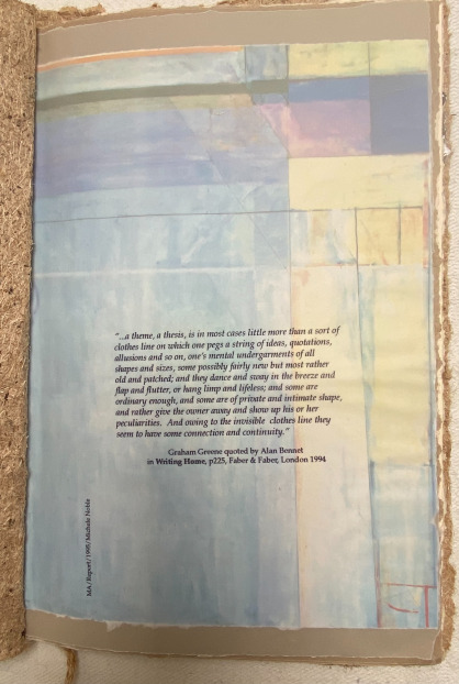 The writing gave me a voice to disagree with some of the views put forward on the course and not only explain the thinking behind the artwork but also what had influenced me through my life. It’s a chance few artists are given. Usually art work has to stand alone, open to viewer interpretation with perhaps some help from the title. It was both an enjoyable and educational experience. My fears about writing it were needless, I had so much material I could have written a book, making it difficult to edit down to the 8000-word count specified!