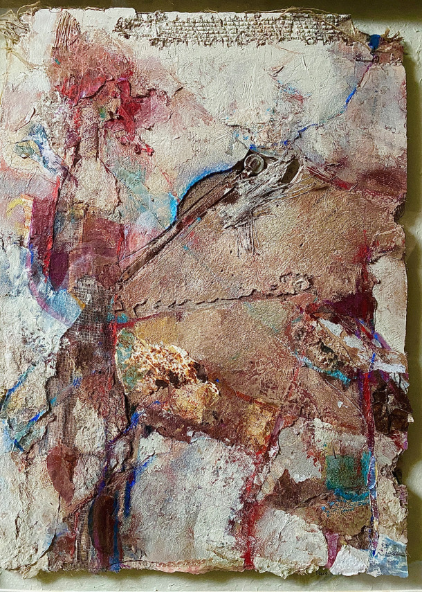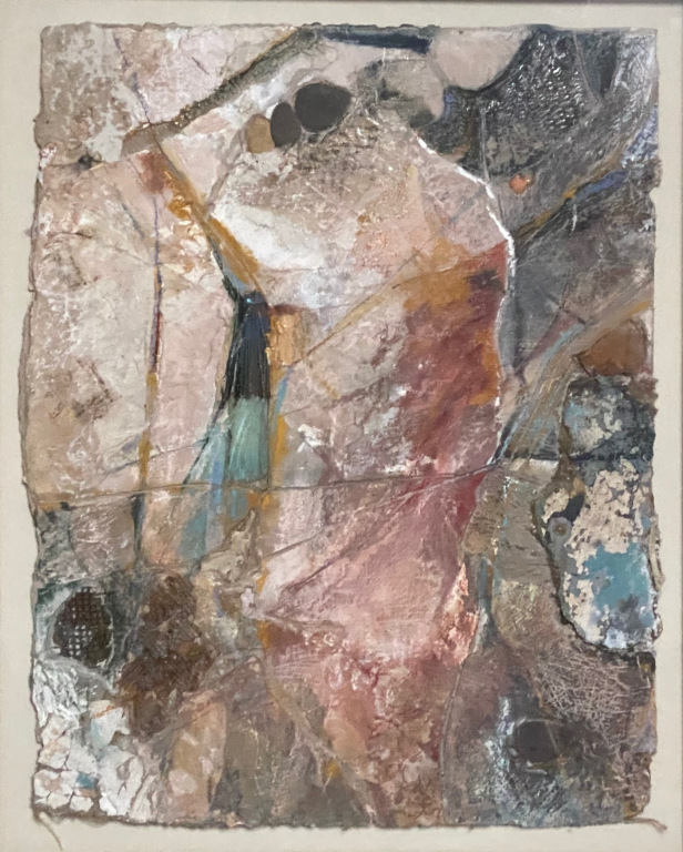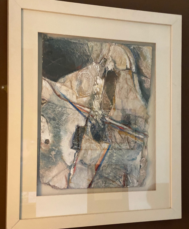 The broken plaster pieces were not uniform and the edges fragile. With so many shapes and sizes and no money to hire outside help, I made the frames myself. It took ages Few of these works have been shown in the UK. My son moved to France to run a guest house and begged the work to display in the bedrooms. The French loved them and if personal problems had not got in the way, I should have priced them for sale. However, he is now back living in North Yorkshire and the artwork is still fully packaged and stored in an outhouse. I have asked him to bring one or two pieces back to me whenever he visits so I can record all the images on a computer file. It will be interesting to see and asess them after all this time. I possess three pieces of this work, see above, while two others are in private collections.