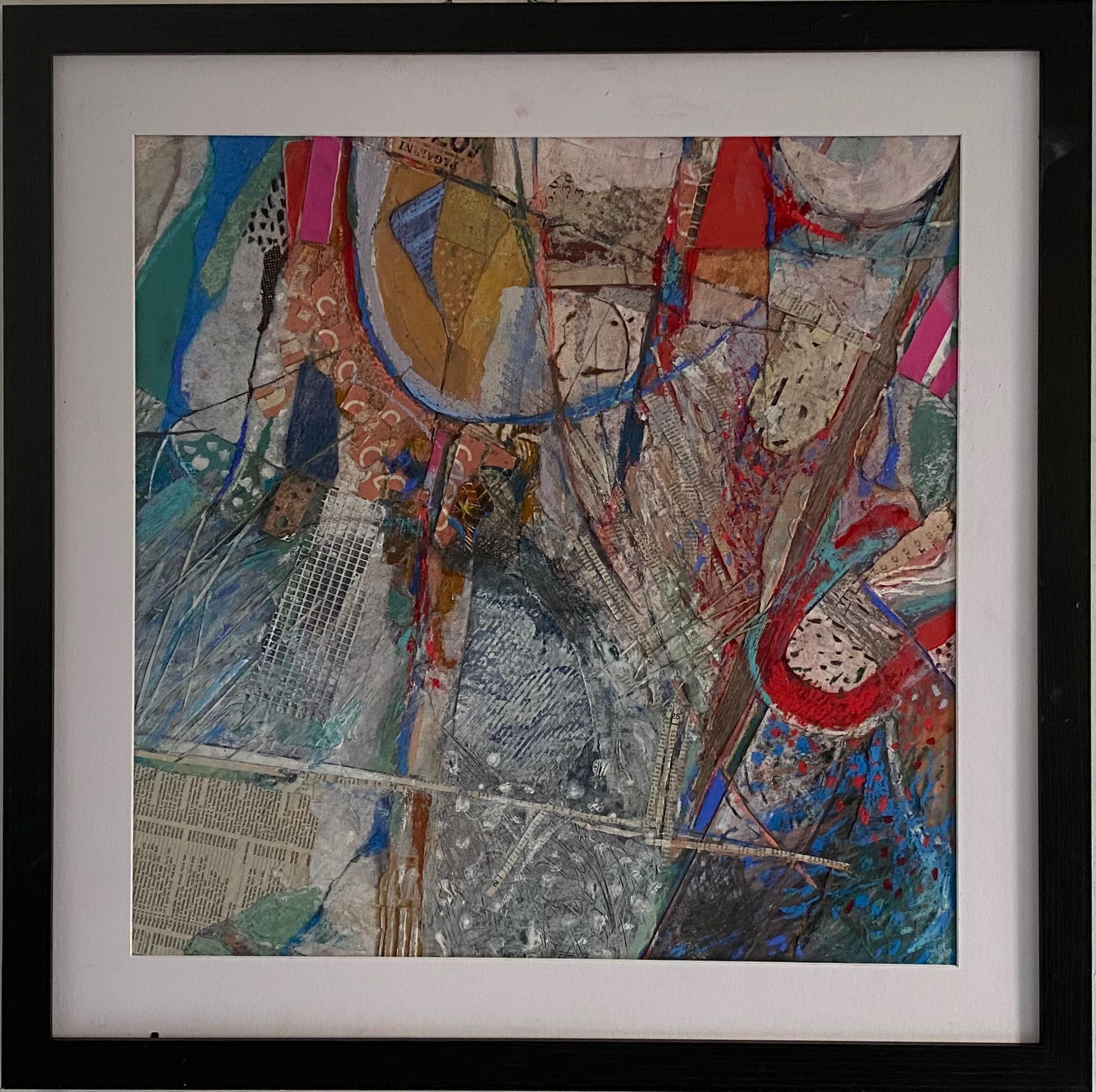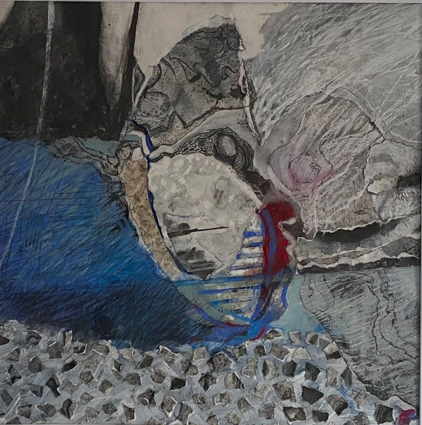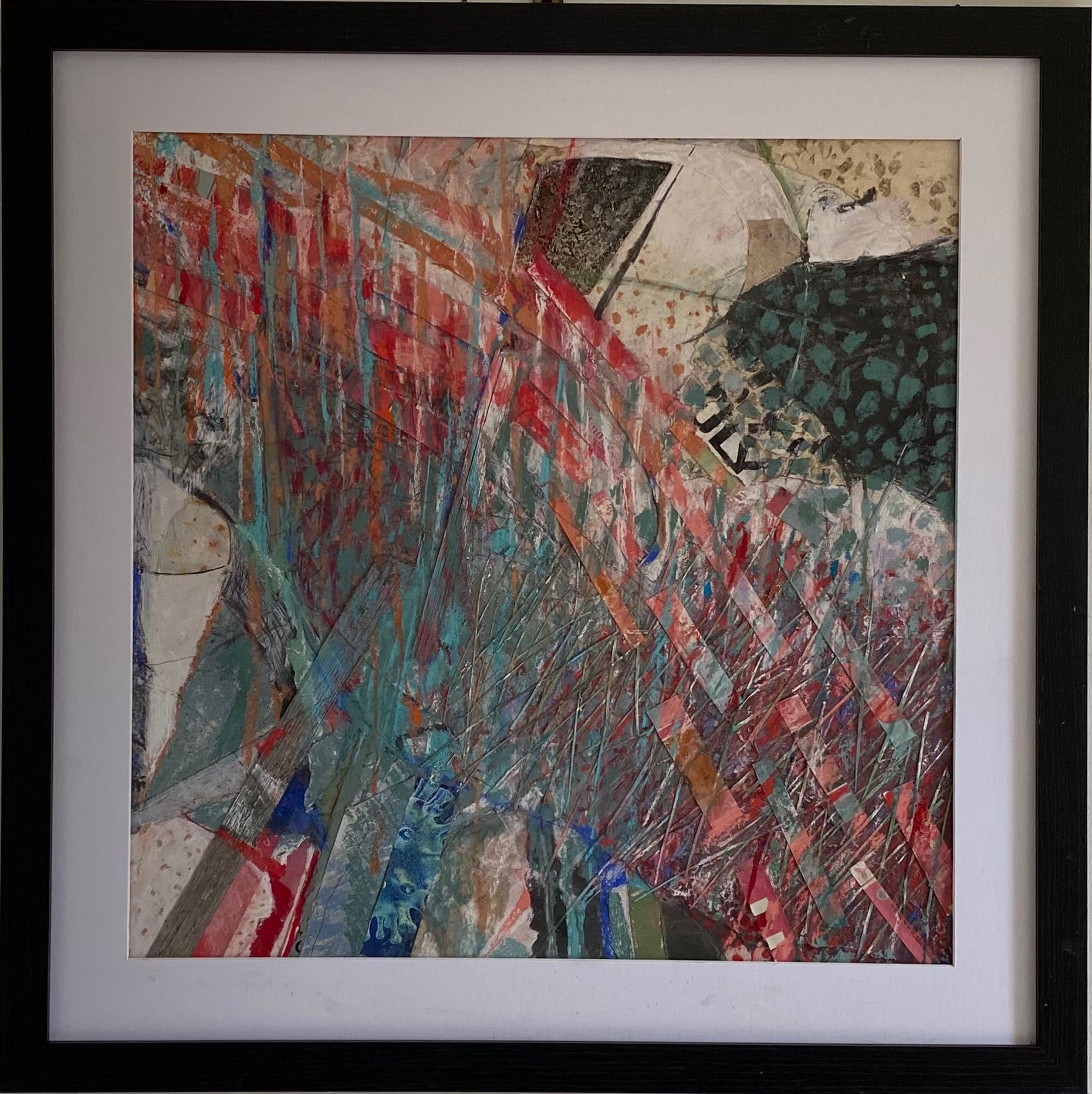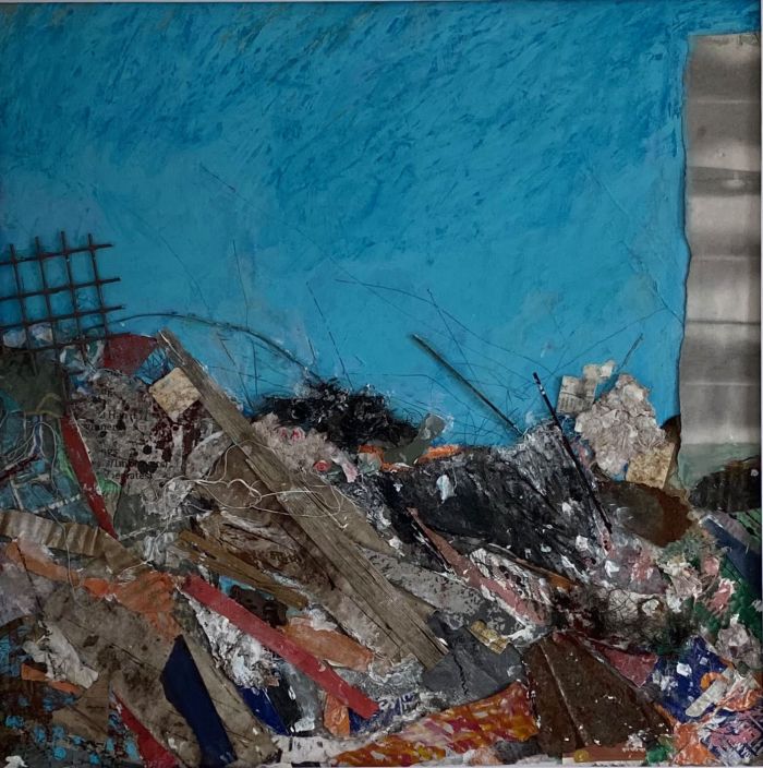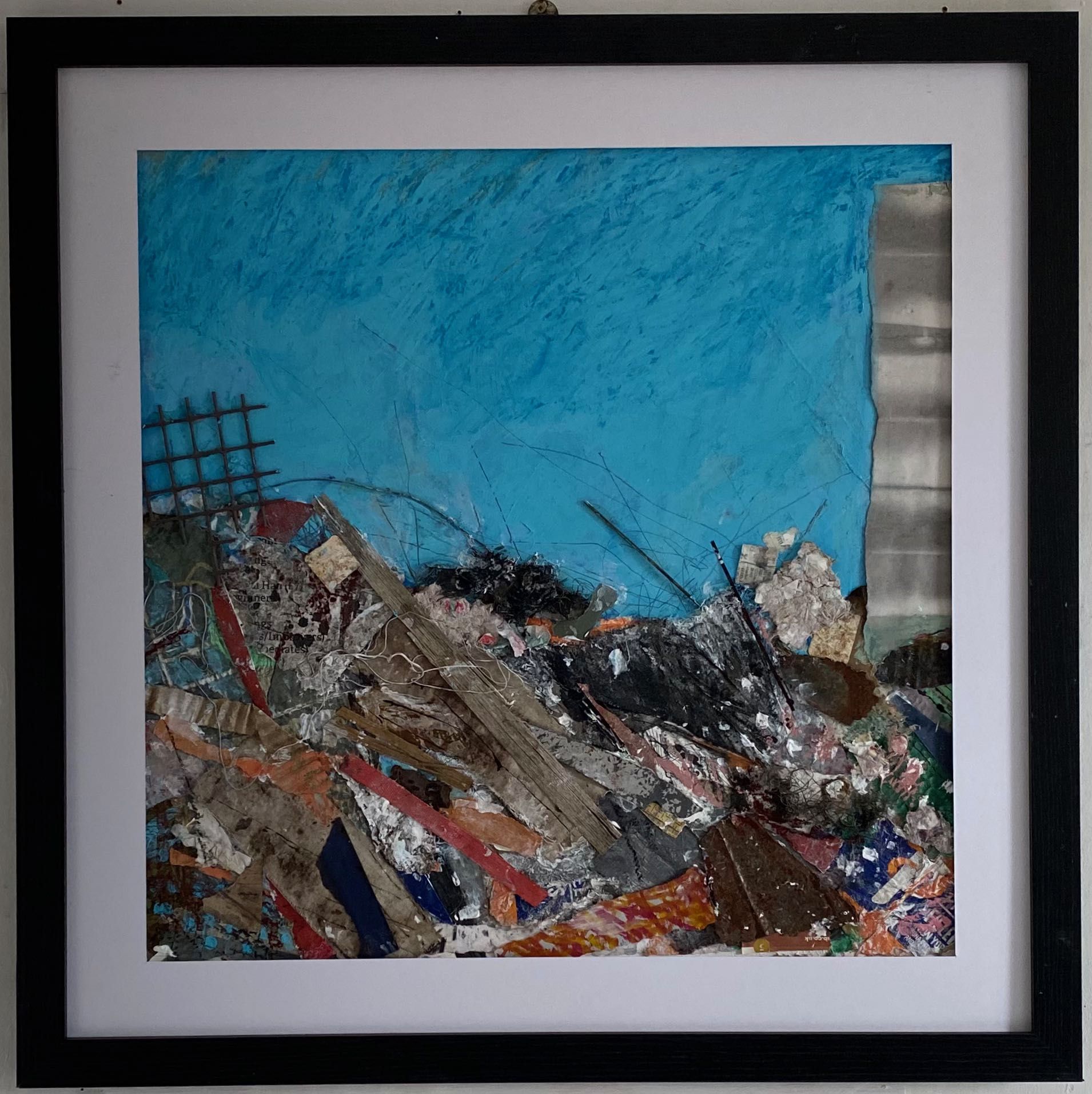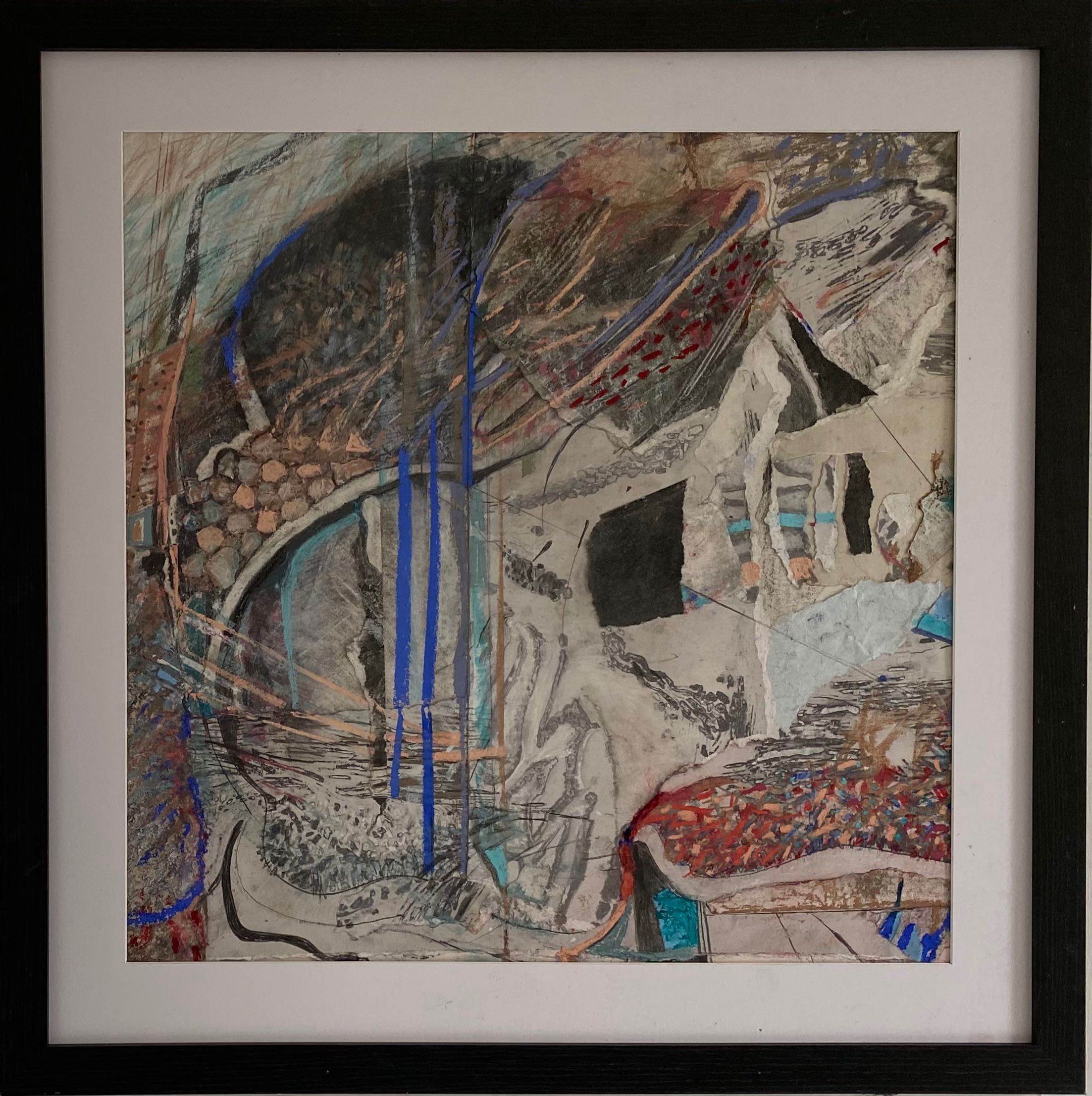 This work is larger than the previous two series I made. It was Lockdown and I ordered more frames off the Internet. When they arrived, there had been some misunderstanding and were not what I expected. They were larger and not the box type, but at least they were black to match the others. I had to rethink how I made them but this was a challenge, a good thing as it kicked me into a new approach. I used far more soft pastel and collaged with paper or thin card. The result surprised me. I never know when I start a piece how it wil turn out when completed, and these had been subconsciously influenced by the news like climate change or Covid.