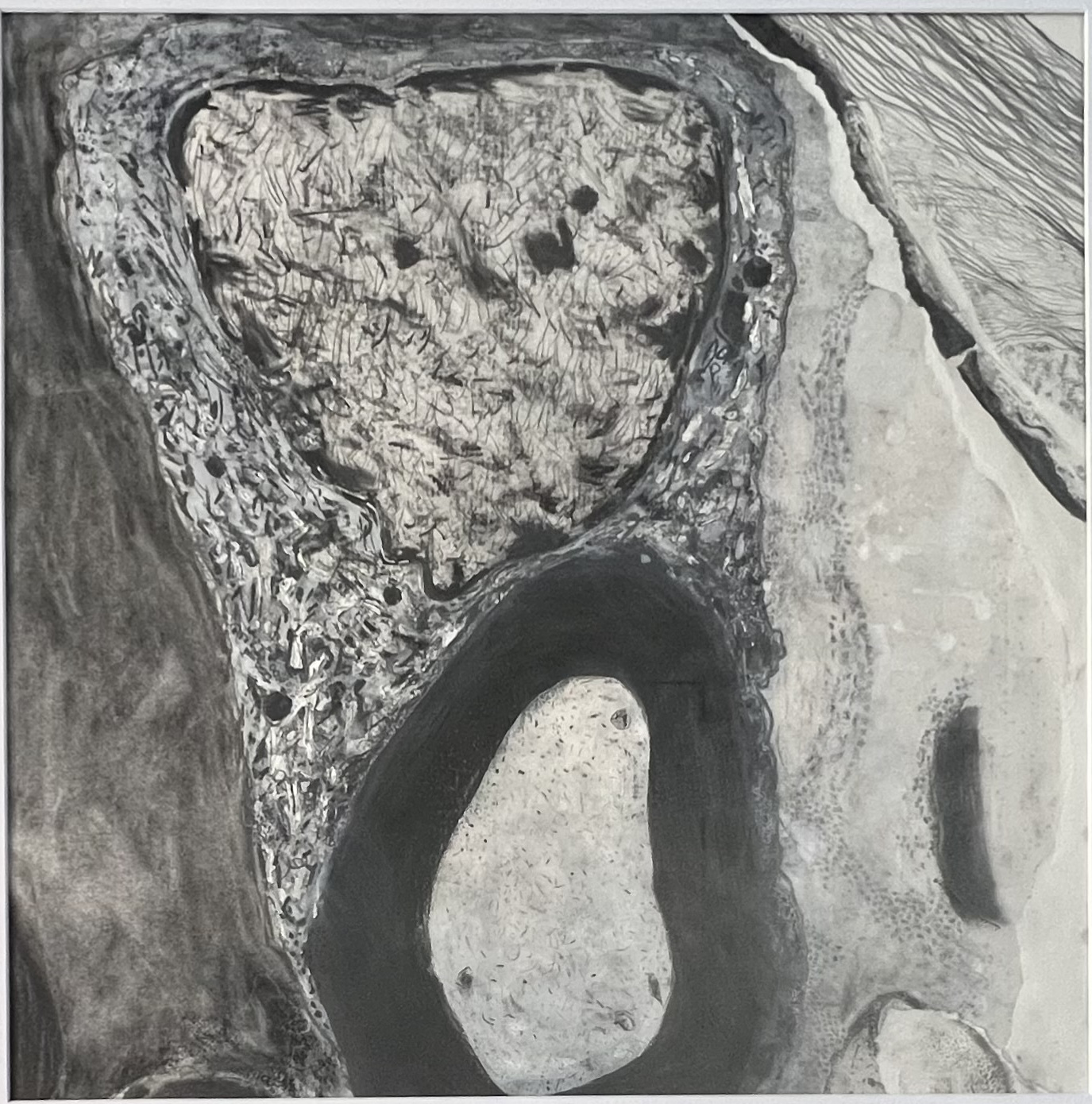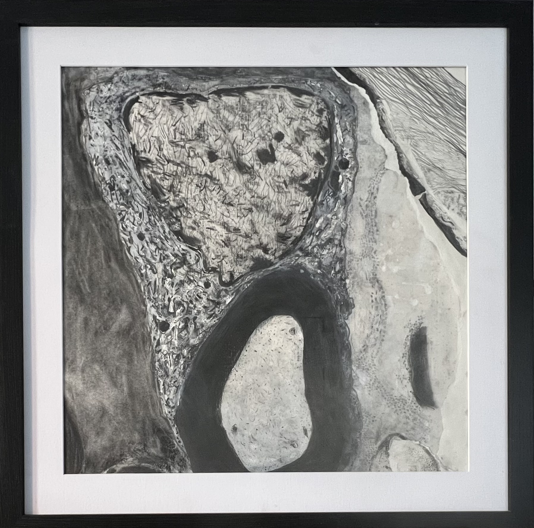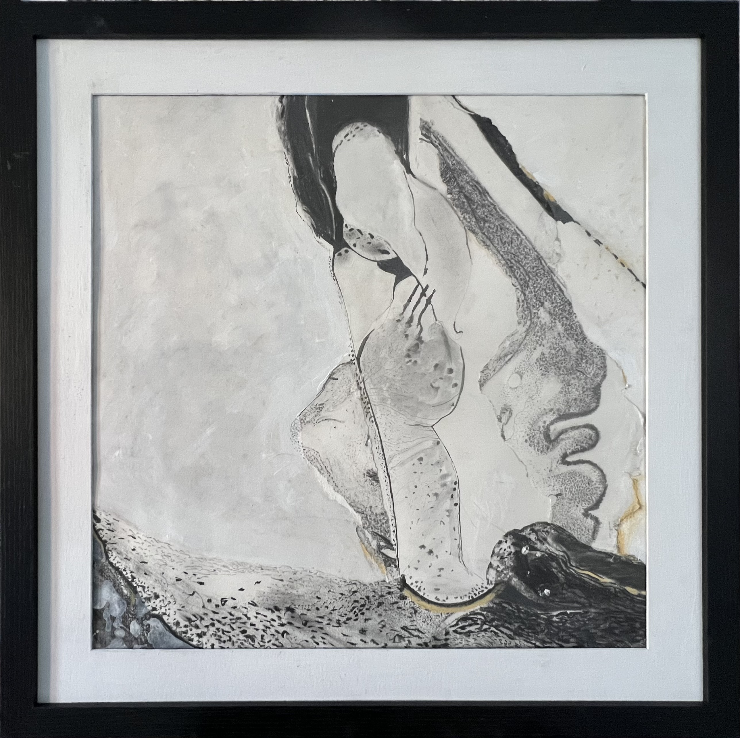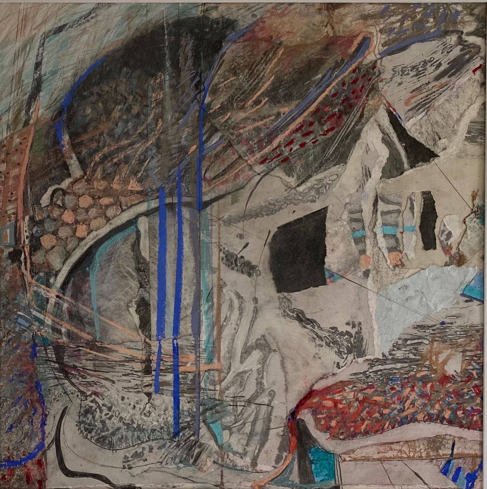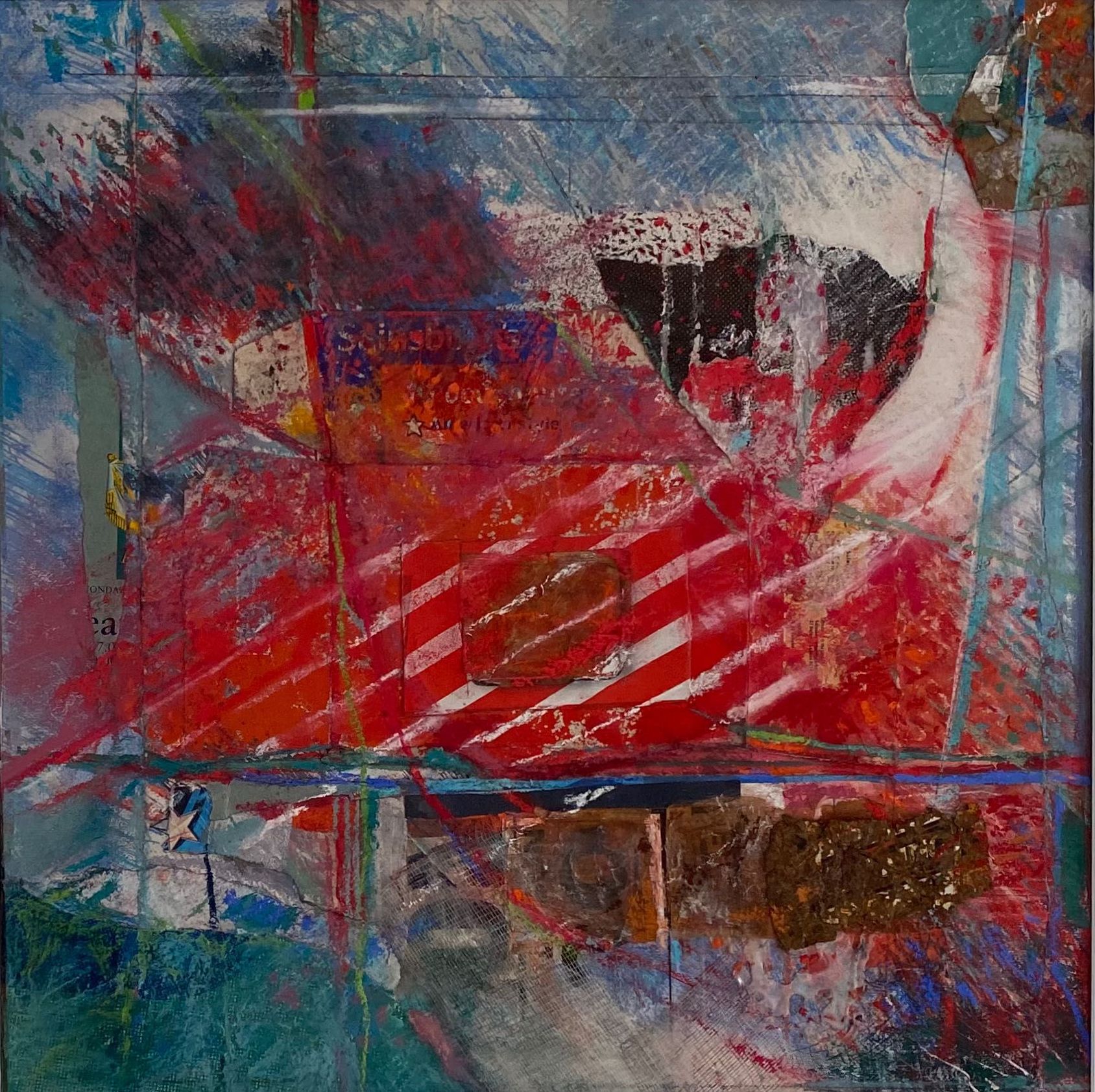 This work is larger than the previous two series I made. It was Lockdown and I ordered more frames off the Internet. When they arrived, there had been some misunderstanding and were not what I expected. They were larger and not the box type, but at least they were black to match the others. I had to rethink how I made them but this was a challenge, a good thing as it kicked me into a new approach. I used far more soft pastel and collaged with paper or thin card. The result surprised me. I never know when I start a piece how it wil turn out when completed, and these had been subconsciously influenced by the news like climate change or Covid.