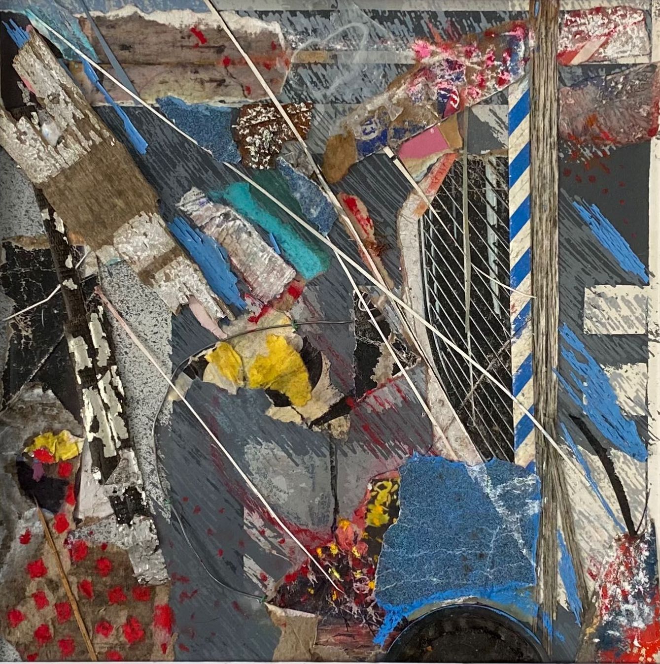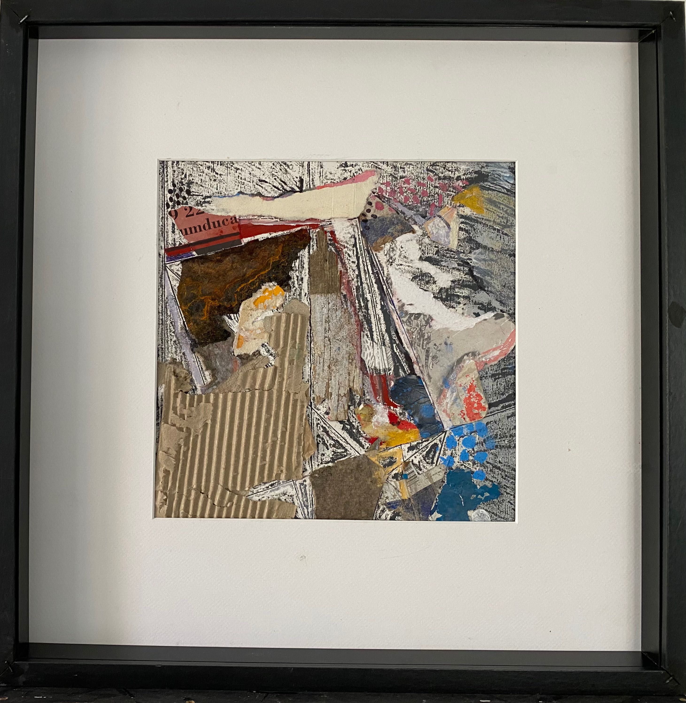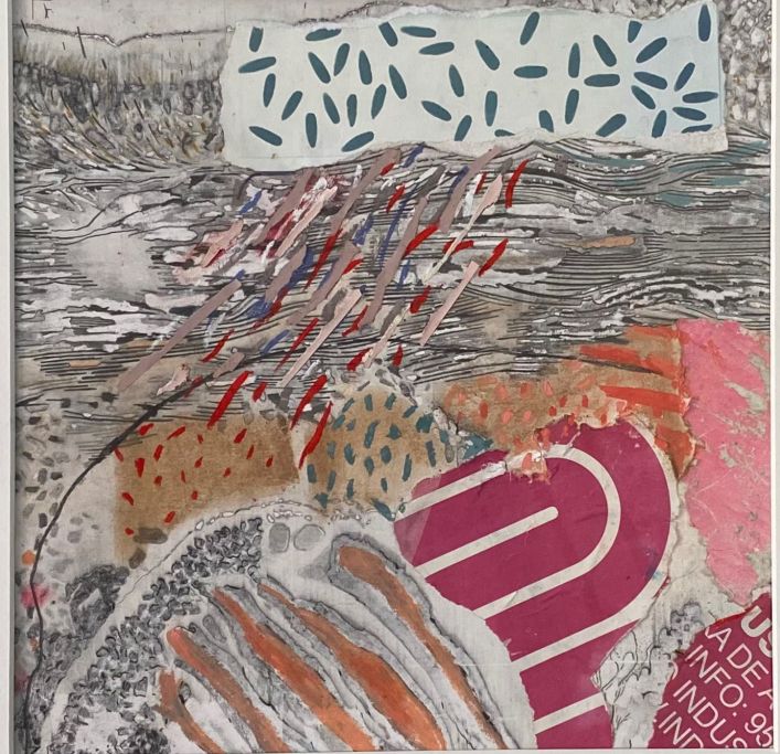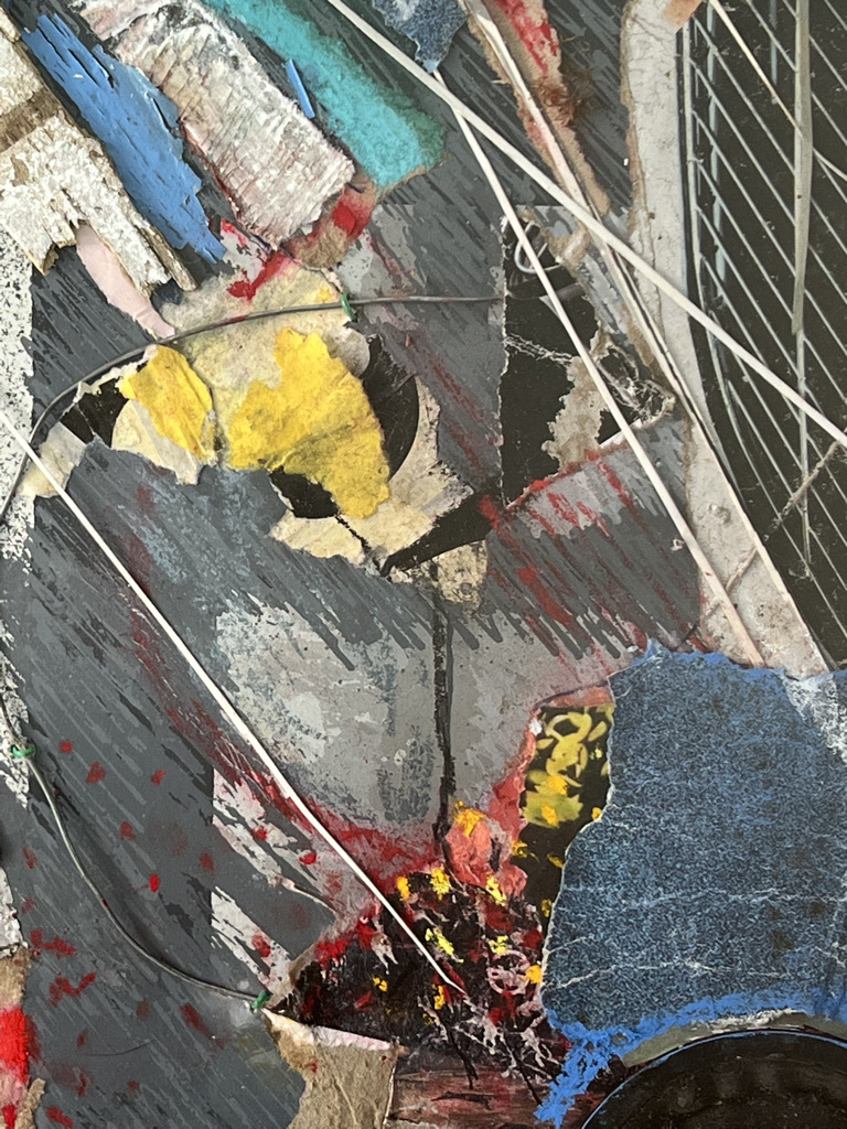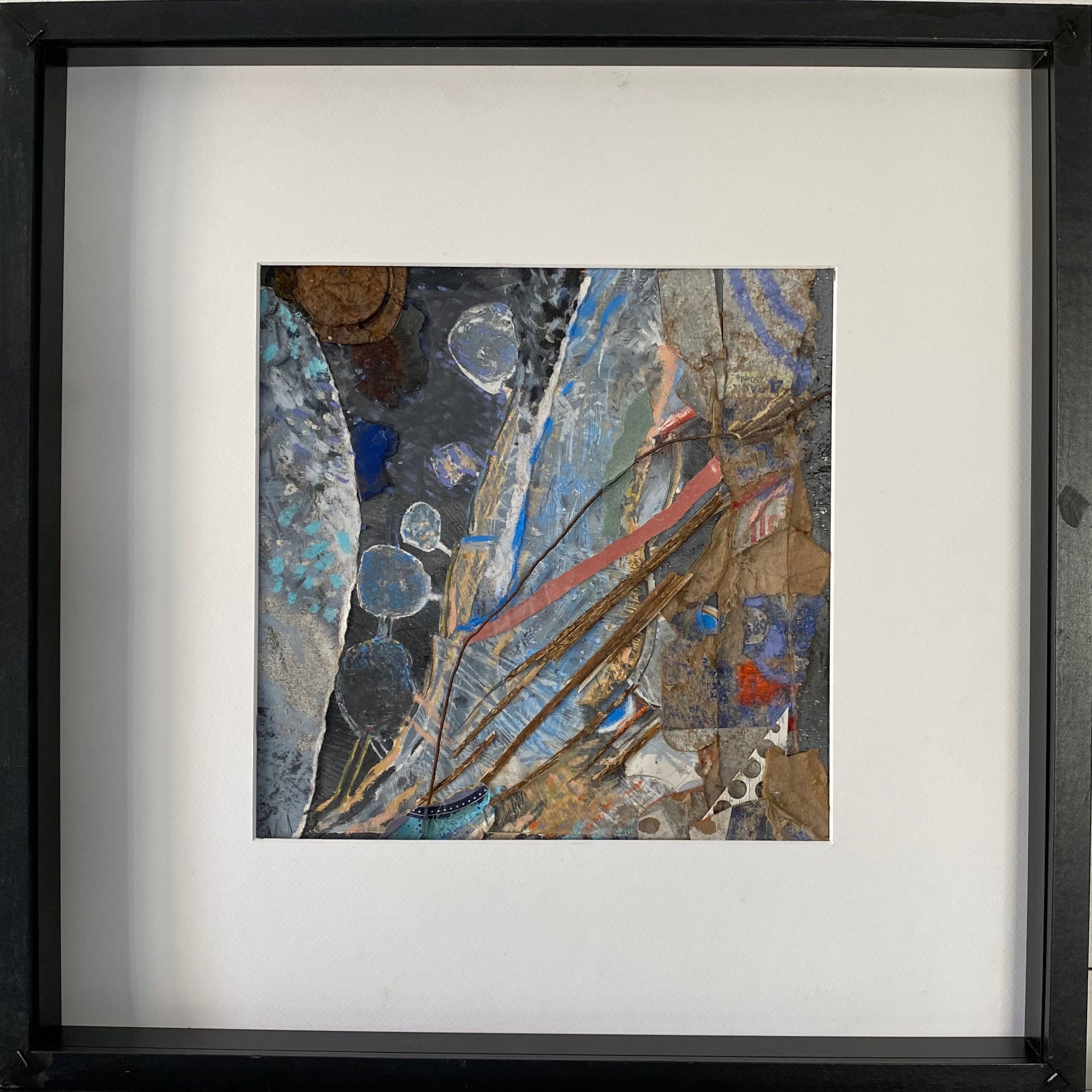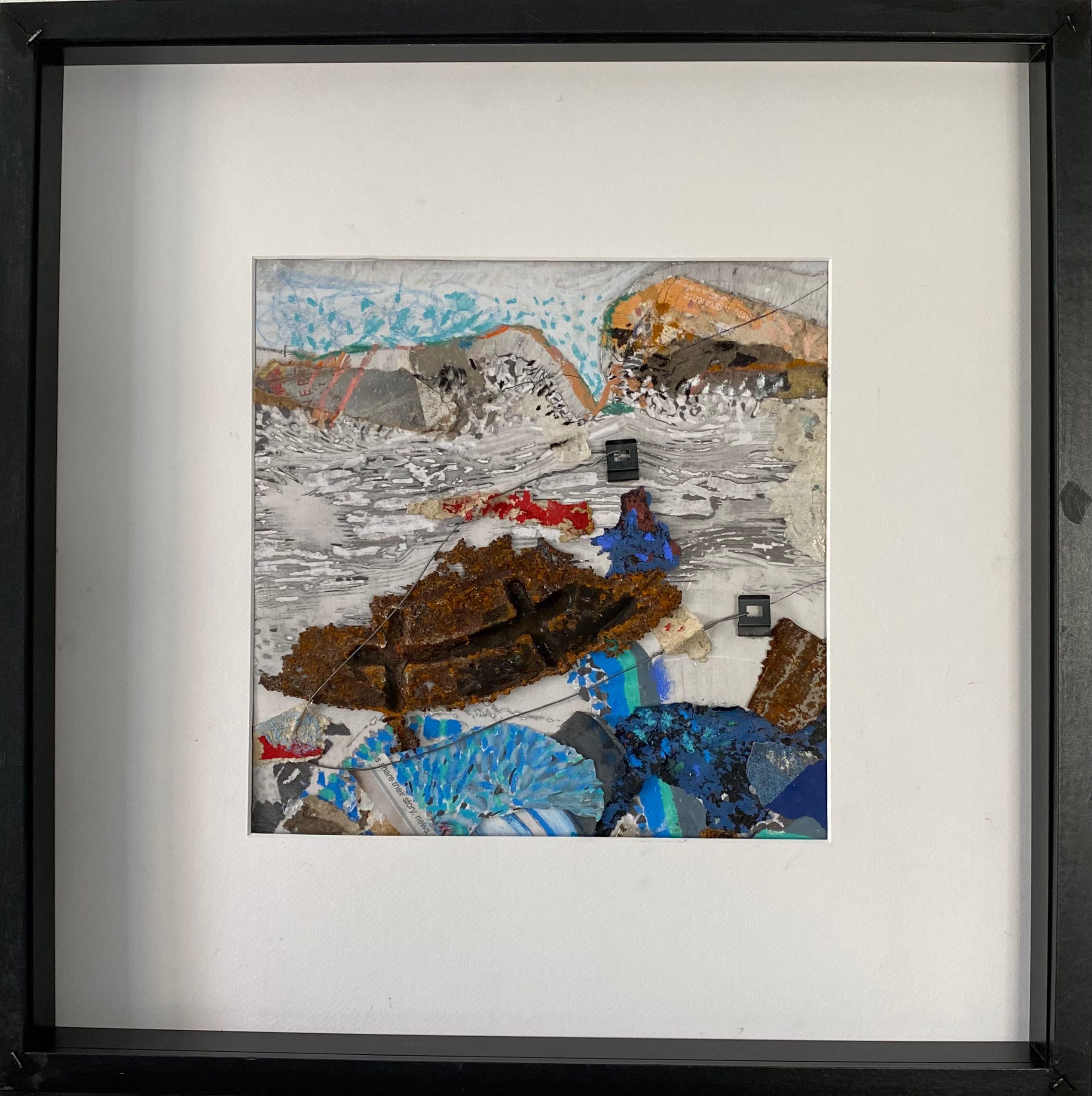 I had a few frames left to make the small works on paper in 2020 and liked the fact they were the same size as the previous small plasterworks. I recycled old prints and used them as a road map to make new work. The work is mixed media using all kinds of thins from wire to bits of old metal, even old drinking straws. at the time I found all kinds of interesting things. Recently I have found it hard to collect anything of interest. The only discarded items seem to be cigarette butts, chewing gum and covid masks. Very disappointing!