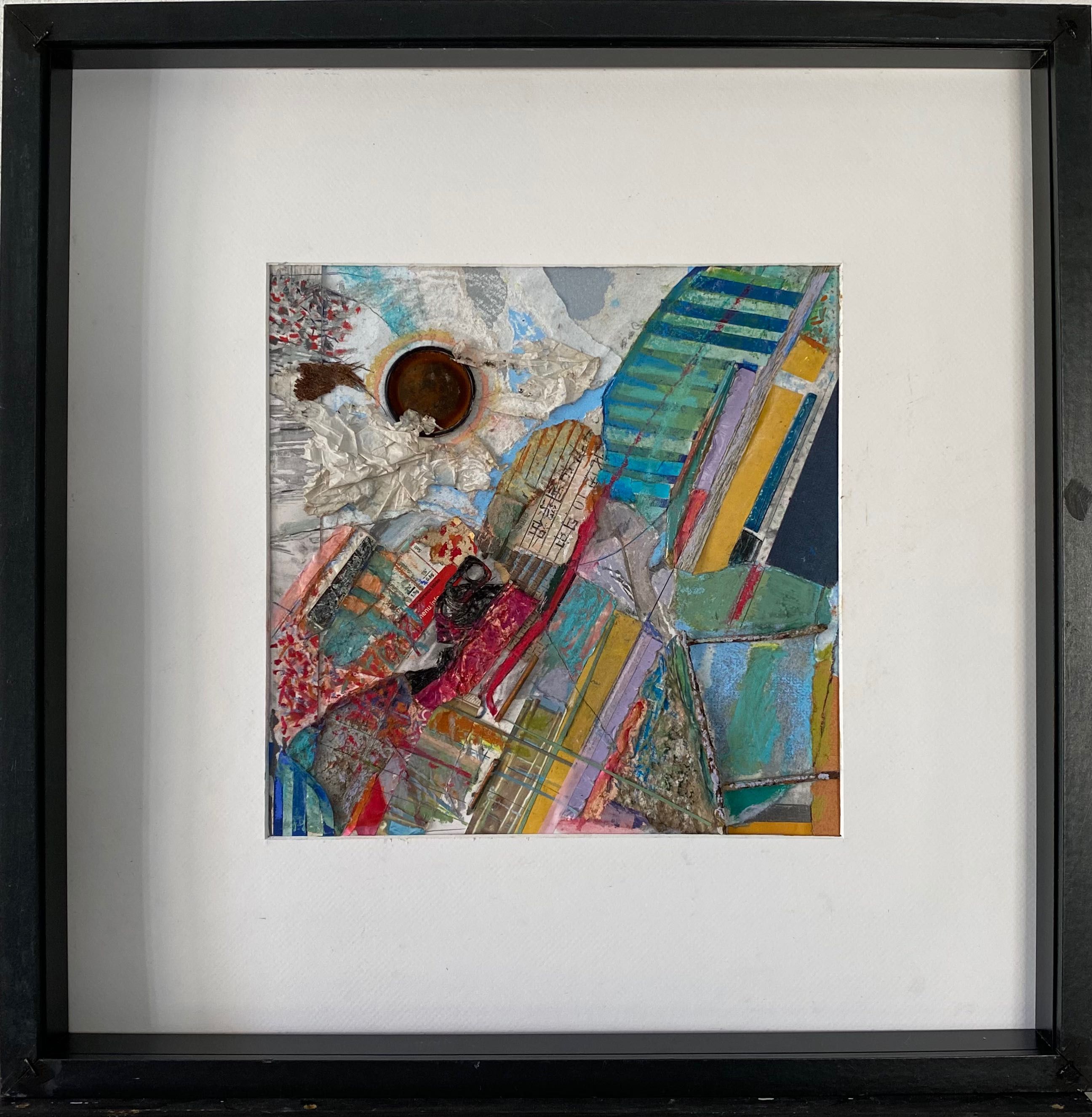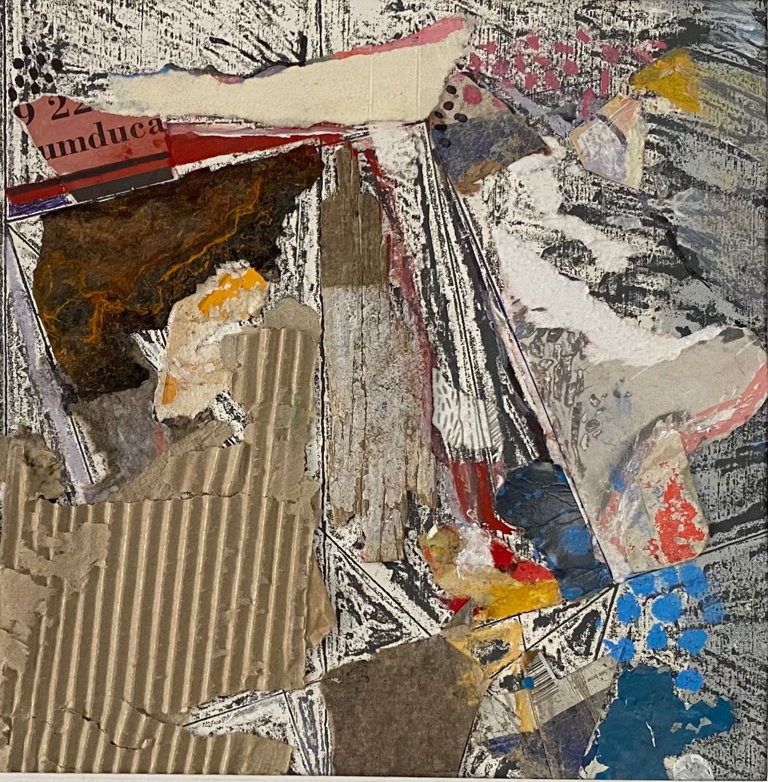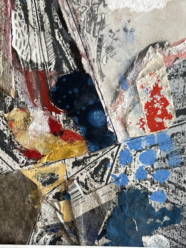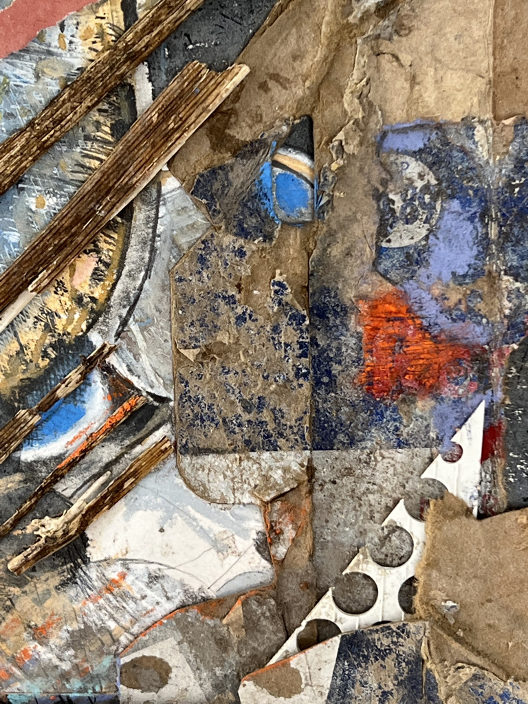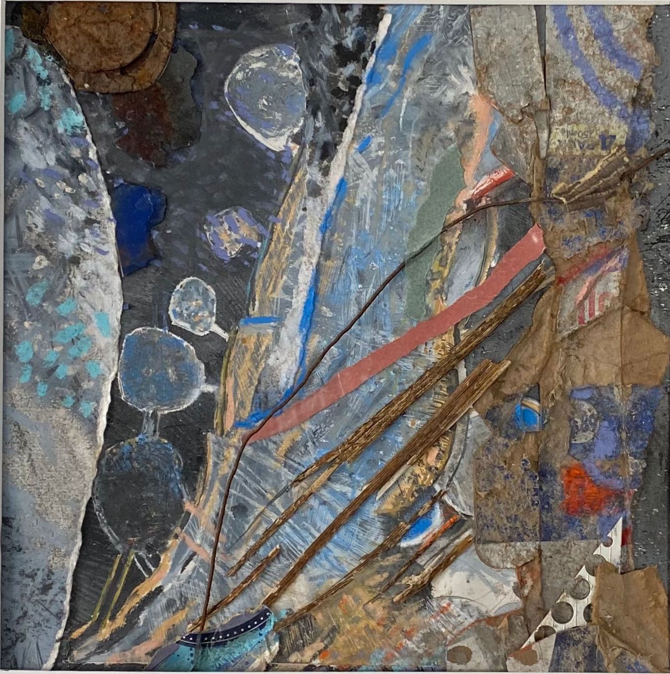 I had a few frames left to make the small works on paper in 2020 and liked the fact they were the same size as the previous small plasterworks. I recycled old prints and used them as a road map to make new work. The work is mixed media using all kinds of thins from wire to bits of old metal, even old drinking straws. at the time I found all kinds of interesting things. Recently I have found it hard to collect anything of interest. The only discarded items seem to be cigarette butts, chewing gum and covid masks. Very disappointing!
